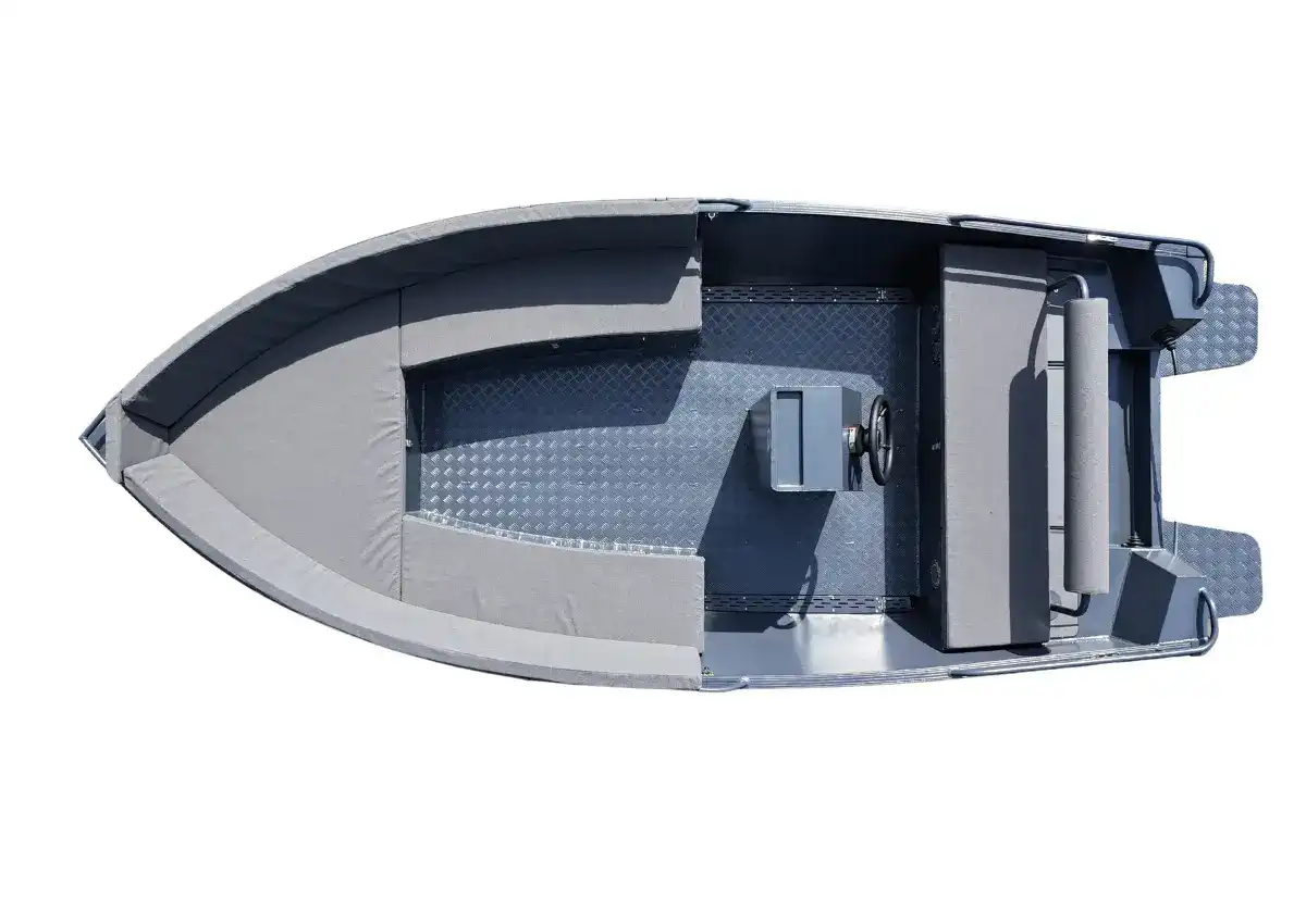 De Qwest R485A is uitgevoerd met een V-bodem en een vlakke huid van 4 millimeter dik aluminium. Ook de volledig afgelaste traanplaatvloer is 4 millimeter dik. Door de brede vorm en de geheel afgelaste constructie voelt de boot stabiel en koersvast aan op het water.