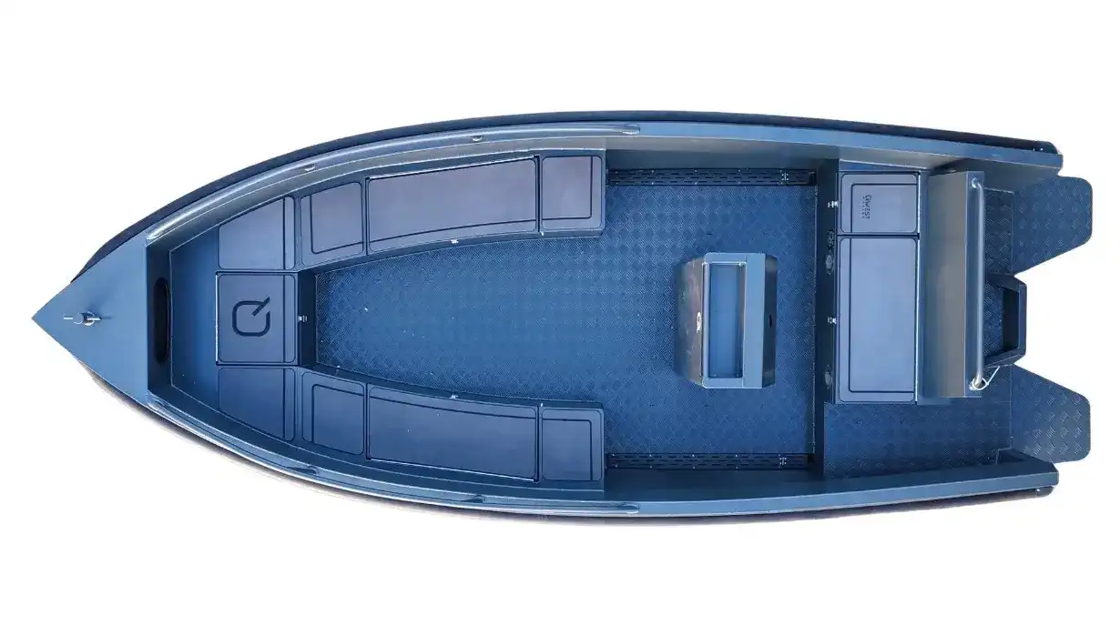 De QWEST S535A is uitgevoerd met een V-bodem en een vlakke huid van 4 millimeter dik aluminium. Ook de volledig afgelaste traanplaatvloer is 4 millimeter dik. Door de brede vorm en de geheel afgelaste constructie voelt de boot stabiel en koersvast aan op het water.